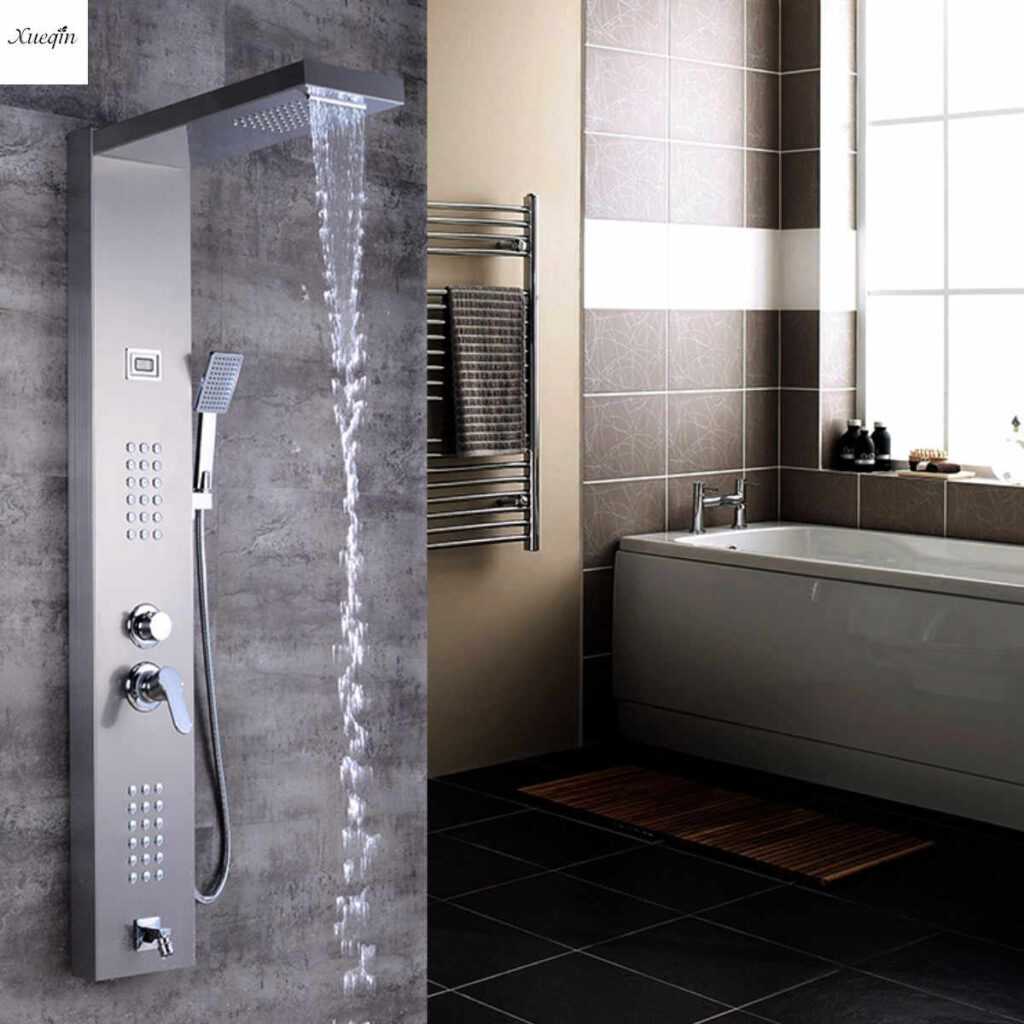 душевая панель с гидромассажем — такая конструкция оснащена форсунками, из которых под высоким давлением сбрасывается вода в сторону тела тела; чаще всего это водяные струи, которые, в зависимости от давления и температуры воды, могут оказывать стимулирующее или расслабляющее действие; здесь стоит обратить внимание на количество насадок и возможность регулировки их угла наклона,