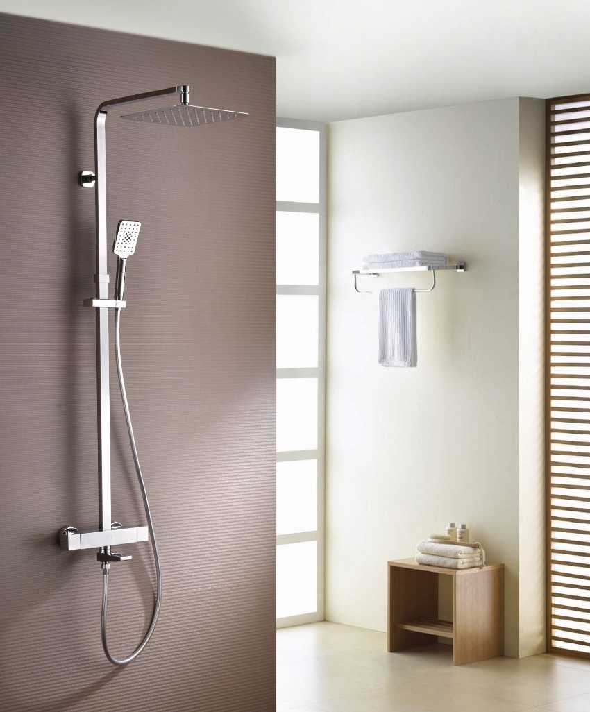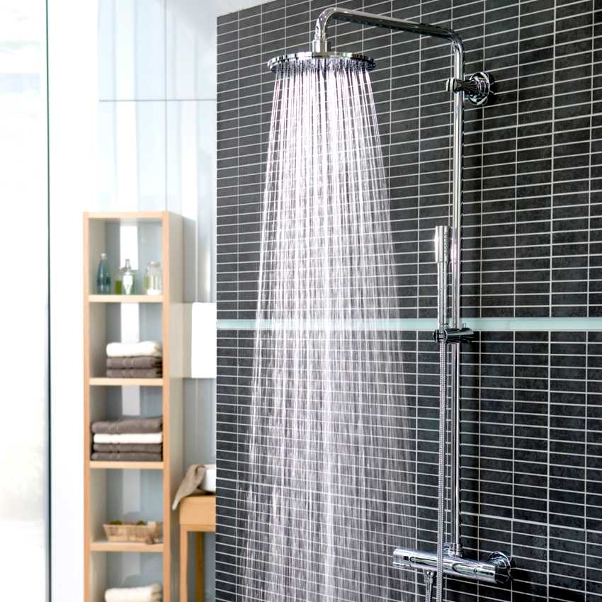 Пользуются популярностью современные душевые стойки с термостатами, в которых заданная температура воды регулируется и поддерживается автоматически на всем протяжении принятия водной процедуры. Термостат устанавливается в смеситель, он реагирует на любые изменения как напора, так и температуры воды.