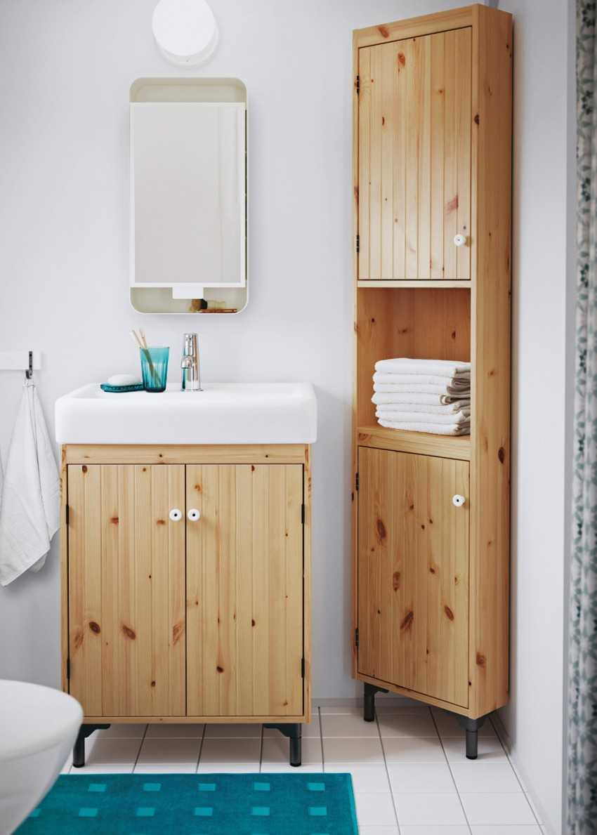 В стандартный набор мебели для ванной входят: умывальник-тумба, навесной шкаф (чаще всего с зеркалом), или заменяющий их «мойдодыр», шкаф-пенал. Если на шкаф места уже не хватило, то к вашим услугам полки и вешалки самых разнообразных конфигураций.