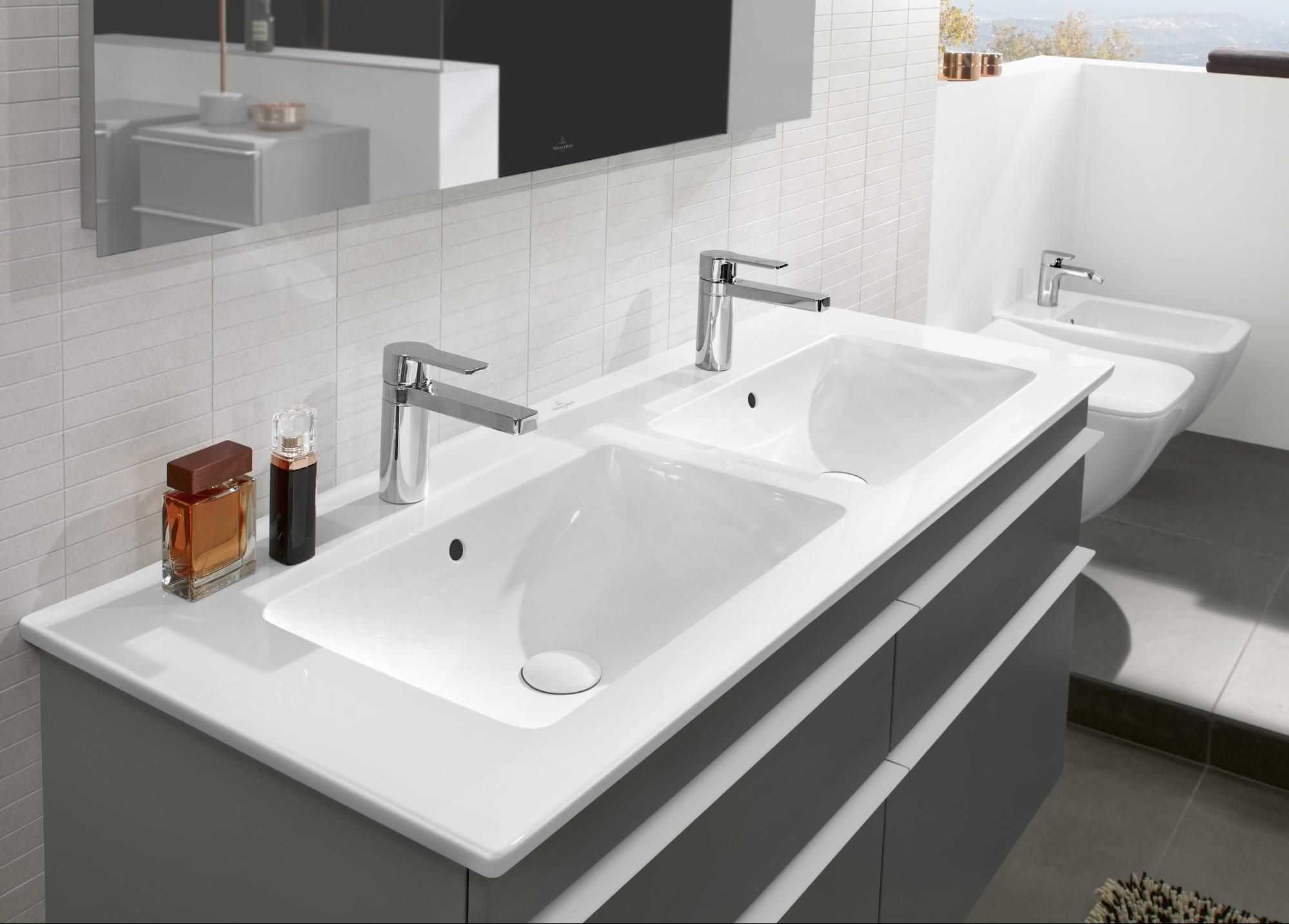 Двойные варианты дороже аналогов: бюджетные модели выполняются в металлах, дорогие – в керамике, камне. Рекомендуем смотреть на больший размер двойных умывальников, что потребует от ванны дополнительного пространства под размещение тумбы.