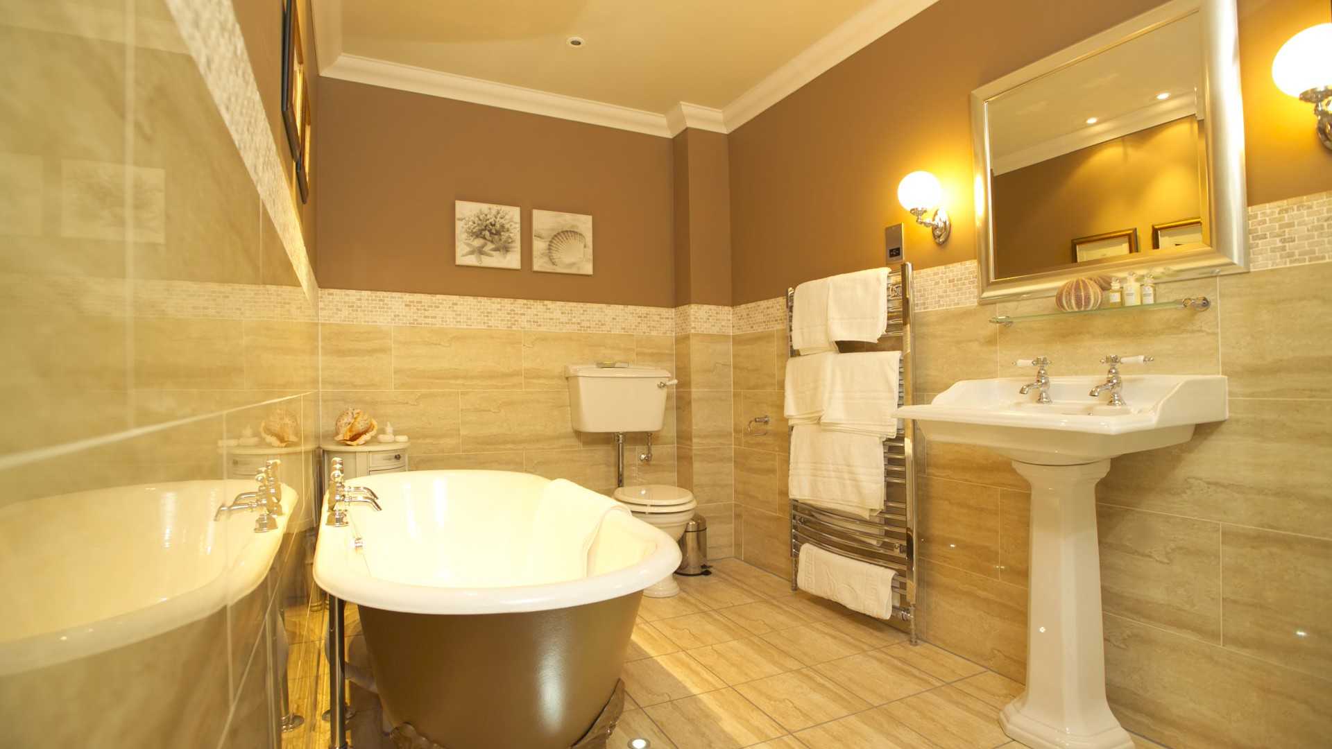 Дополнением к интерьеру, оформленному в традиционном стиле, выступают картины, мягкие кресла и даже фигурные полотенцесушители.
