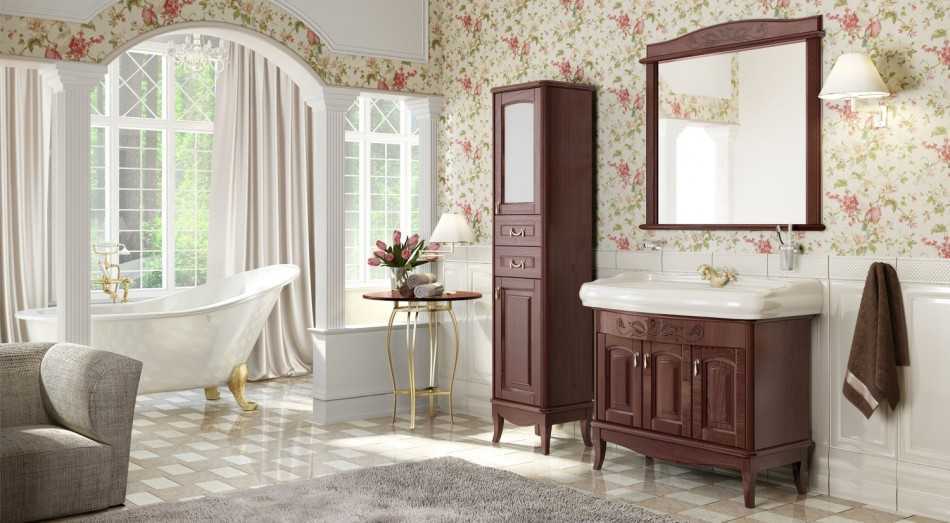 Чтобы оформить ванную в классическом стиле, необходимо выбирать мебель из элитных пород дерева, которая отразит изысканность обстановки.