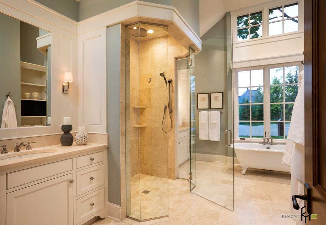 Душевые кабины являются отличной альтернативой традиционной ванной, сегодня они также разнообразны по форме и размеру. Особенно органично будет смотреться душ с прозрачными стеклянными стенками в интерьере большой ванной комнаты. Примеры душевых кабин, подобранных в современный ремонт в ванной комнате, показаны на фото ниже.