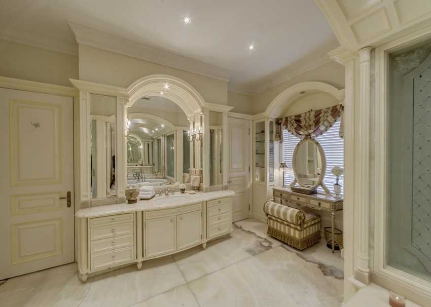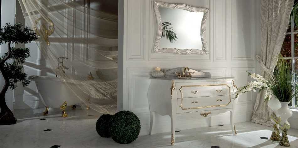 Зеркала в ванную классического стиля обрамляют в багет с богатой резьбой и позолотой. Они считаются одной из главных декоративных «изюминок». Альтернативой служат зеркала, занимающие всю стену над умывальником, по обеим сторонам которых располагаются полки или вертикальные пеналы.