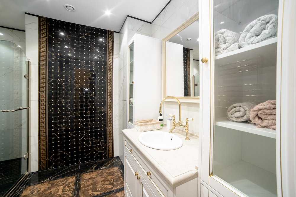 Глянцевая плитка, имитирующая мрамор, в обрамлении позолоченных декоров придаст ванной комнате гармоничной строгости и изысканности.