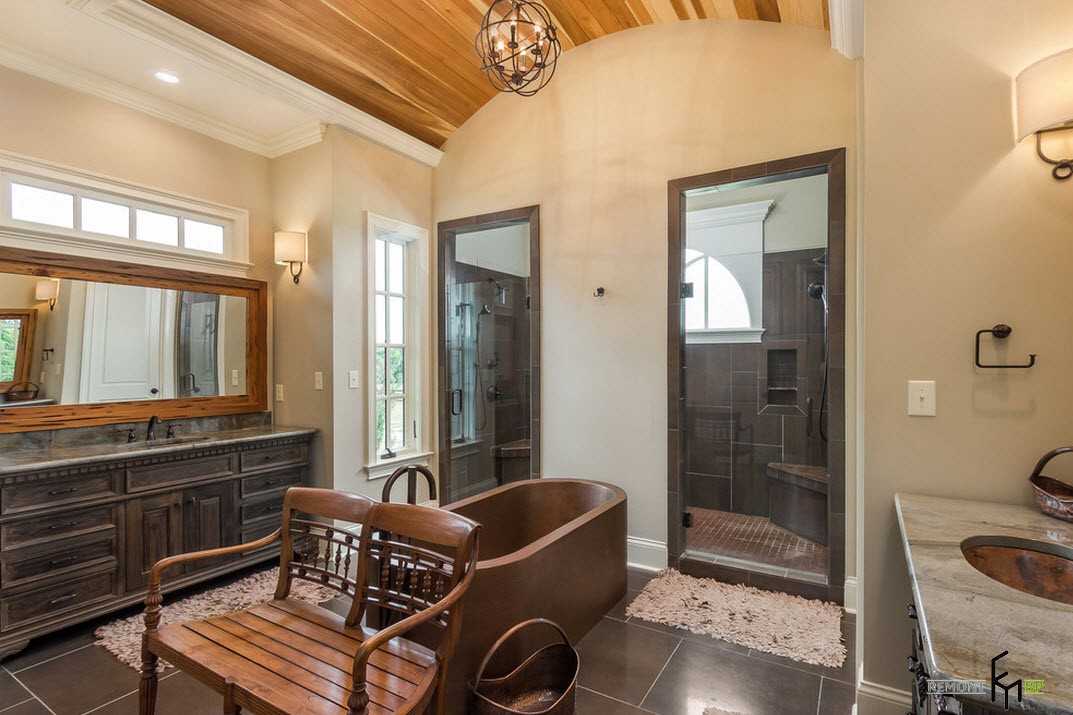 Аутентичная ванная комната предназначена только для водных процедур, но современные хозяева нередко стремятся разместить там унитаз, исходя из практических целей. Для него нужно выделить отдельную зону, чтобы не нарушить целостность композиции.