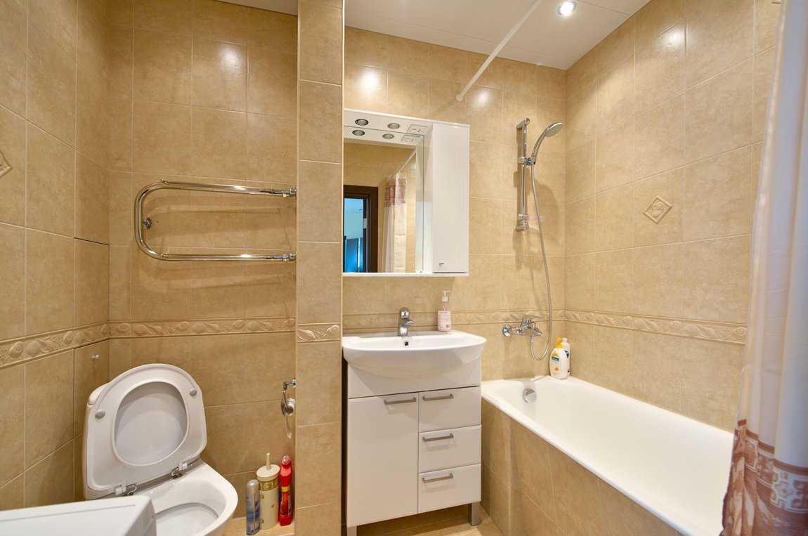 На фото великолепная золотистая штора для ванной, а также встроенный шкафчик-пенал с фрезеровкой.
