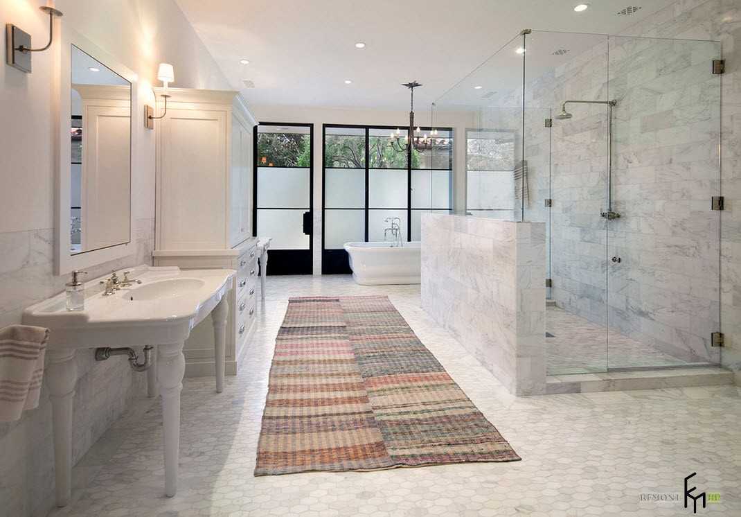 Пол. Варианты: преимущественно используют натуральный мрамор или керамическую плитку под мрамор; реже — наборной паркет и наливной пол. Пушистый коврик на полу усилит атмосферу уюта.