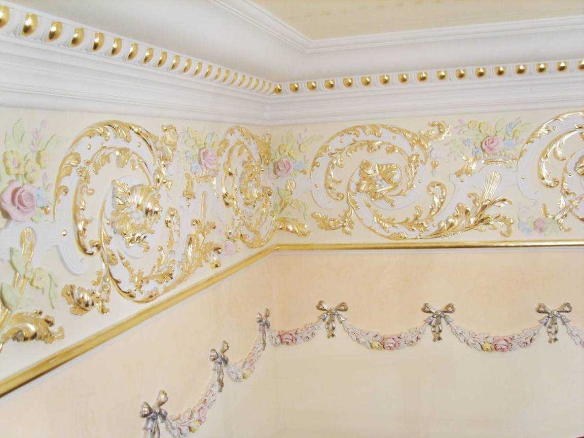 При оформлении стен часто делается фресковая роспись, а в более бюджетных вариантах считается допустимым, хоть и не слишком желательным с точки зрения практичности и долговечности, ещё и использование тисненых водостойких обоев с вензелями.