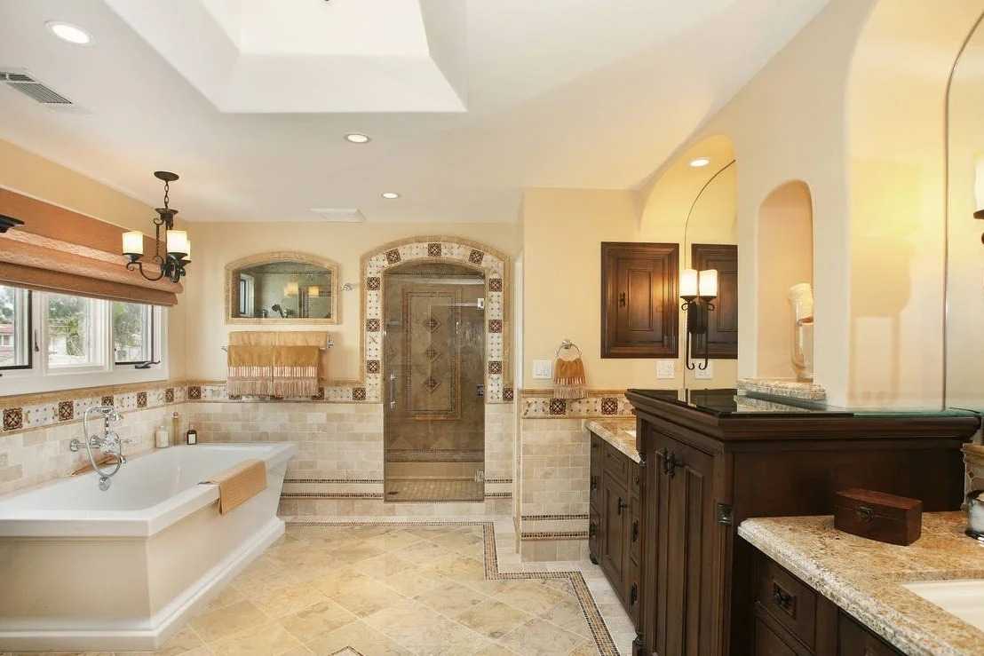 Интерьер в испанском классическом стиле сильно отличается от английского и итальянского варианта. Совершенно нет элементов античного происхождения, зато вдоволь готики, старинной резной мебели из древесины, патинированного металла. Если заглянуть в ванную в испанском классическом стиле, может на мгновение показаться, что оказались в музее.