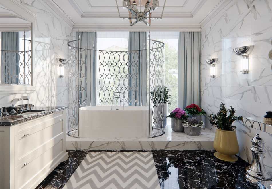 Античную атмосферу создает отдельностоящая ванна на подиуме или в эркере. Несмотря на свою высокотехнологичность, классическому стилю подойдет и джакузи: главное добавить изделию изящных элементов. Например, установить экран с декоративной решеткой.