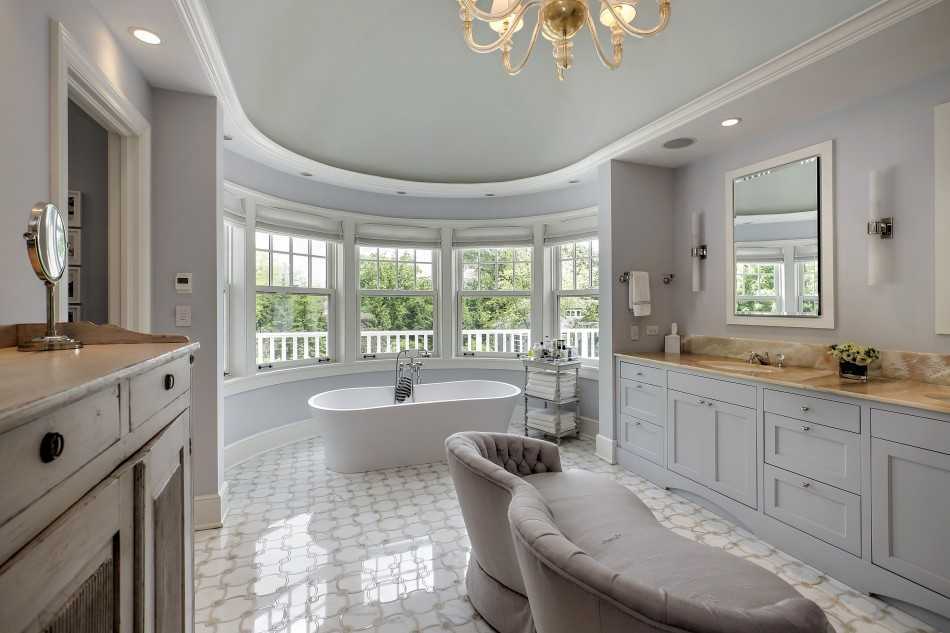 Расположение ванной чаши — это отдельная тема. Эта «аристократка» может стоять на массивном основании у стены или прямо по центру комнаты. Эркер — ещё одно очень романтичное место для чаши!