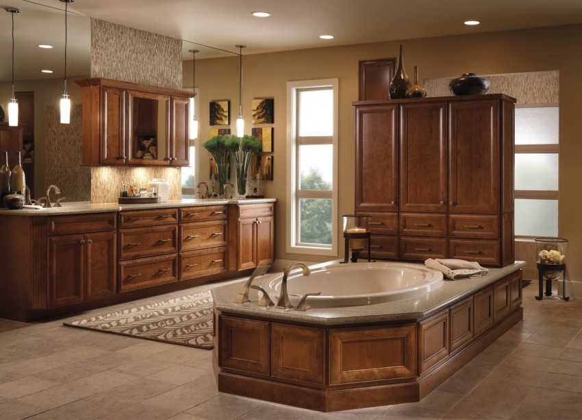 - Иногда может подойти стиль кантри. Ему присуще использование грубоватой мебели. Например, ванная, сделанная в таком стиле, будет напоминать дубовую бадью. Можно использовать плетённую бадью, отделку под дерева и неяркий тёплый свет.
