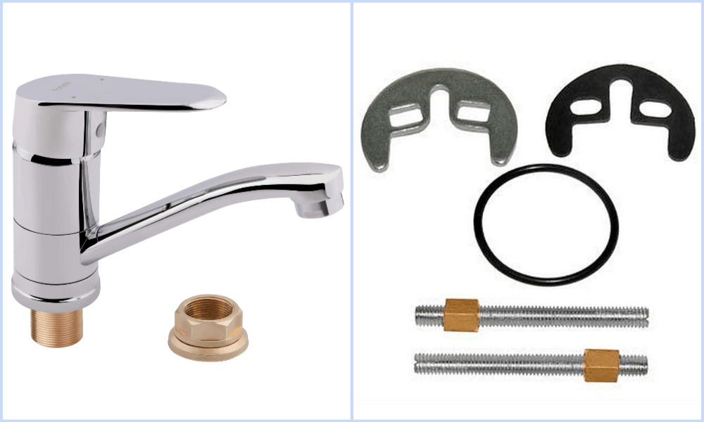 - При конструкции с резьбовыми шпильками поступают аналогично: подсоединяют к корпусу подводки и шпильки, вставляют его в мойку и прижимают гайками через металлическую пластину с резиновой прокладкой.
