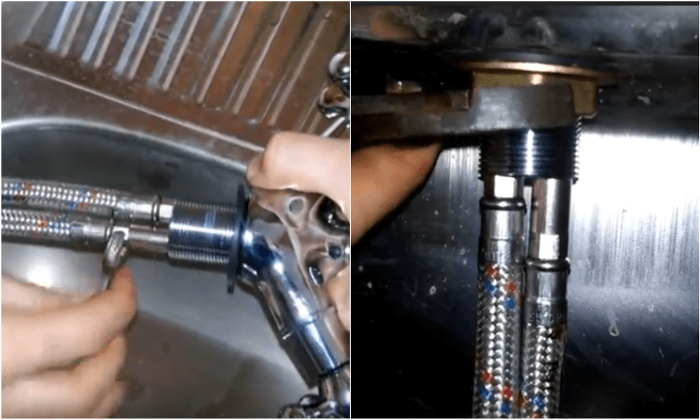 - Установка кухонного смесителя своими руками в мойку с подключением подводящих шлангов.