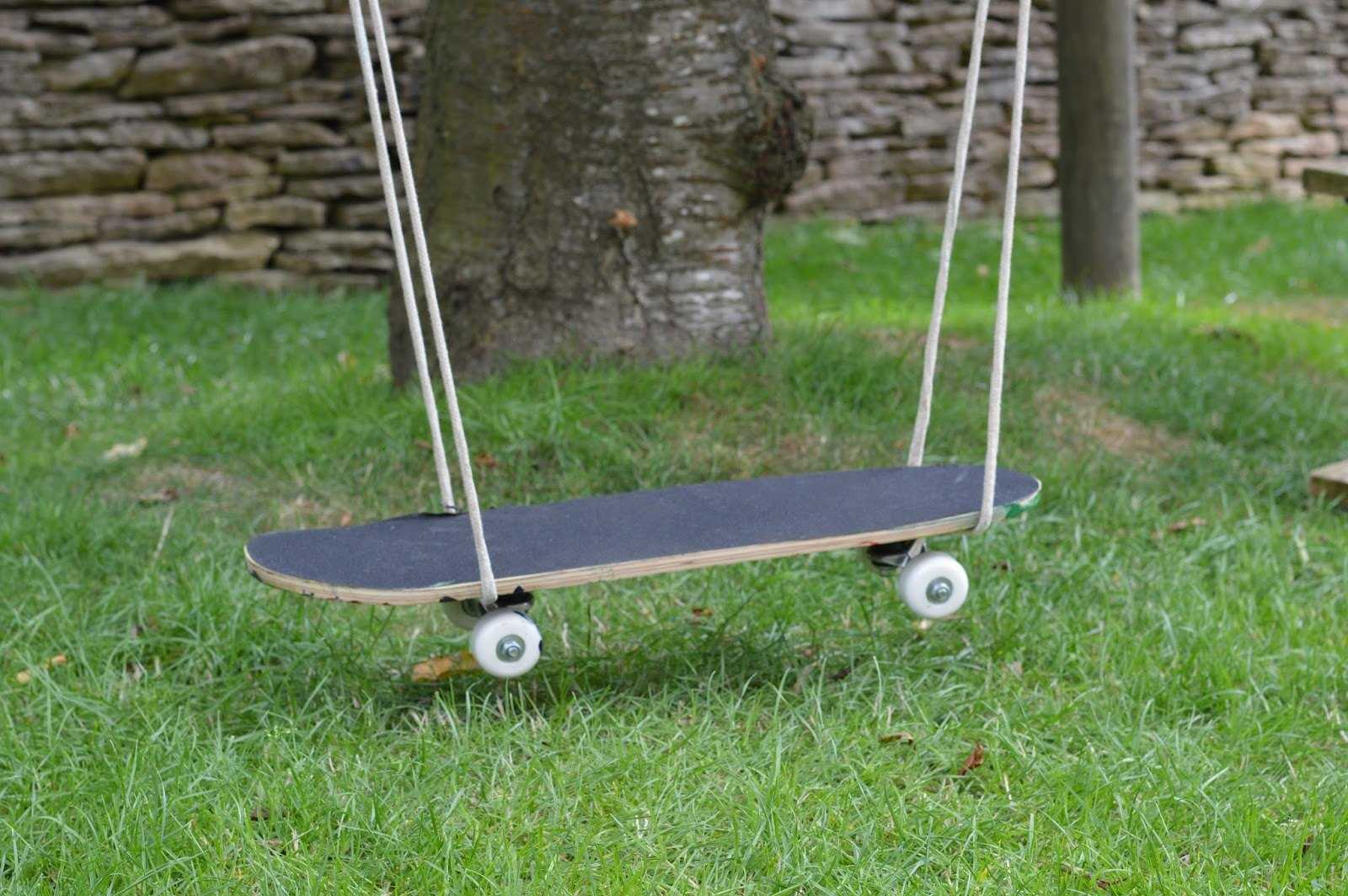 Подвесить на такую опору можно сидение любого типа – от простейшей доски, показанной на изображении, до нарядной скамейки со спинкой.