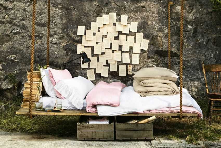 Кстати, если сидение делать лень или не из чего, можно использовать проверенный путь – собрать их из паллет. Такие качели из поддонов своими руками делаются элементарно и могут быть любого размера – от небольшого сидения до полноценной подвесной кровати, как показано на фото.