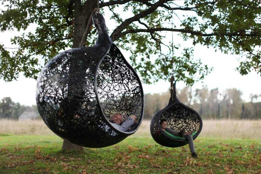 Плетеные качели в виде сфер достаточно вместительны и удобны