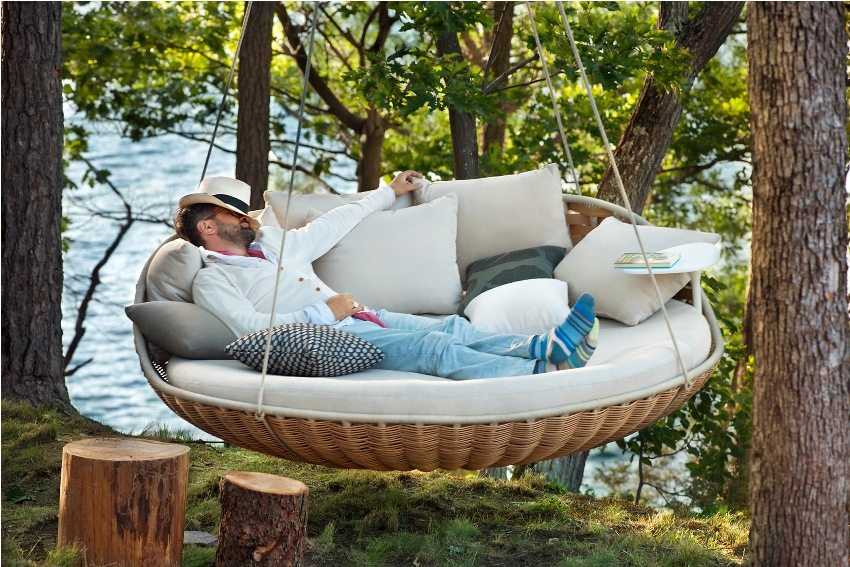 роскошные креативные дачные качели на основе не спиленных деревьев с навесом;