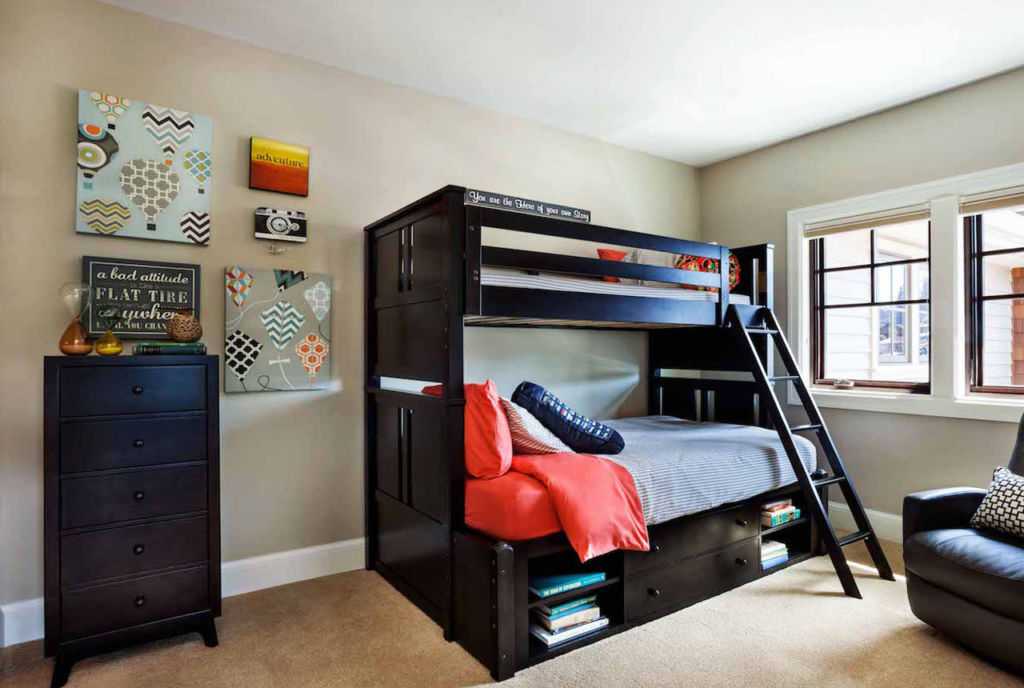 Большинству мальчиков нравится спать высоко. Чувство уюта, контроля. Если будете использовать классическую двухъярусную кровать и будет спор за место, лучше отдать решение случайности — подбросьте монетку. Соревнование за место и другие плюшки можно устраивать хотя бы с 8 лет, тогда дети более осознаны и чаще адекватно и без обид принимают поражения.