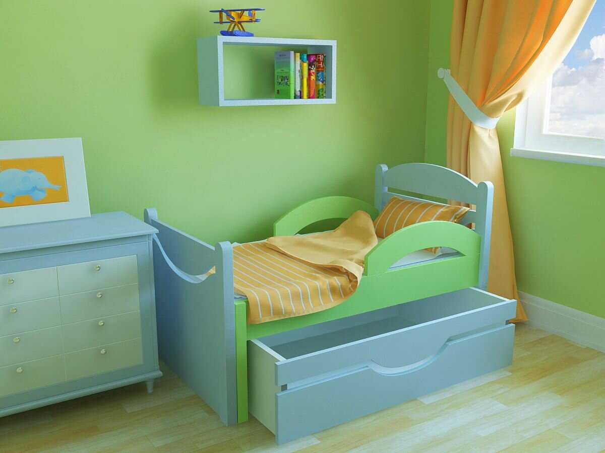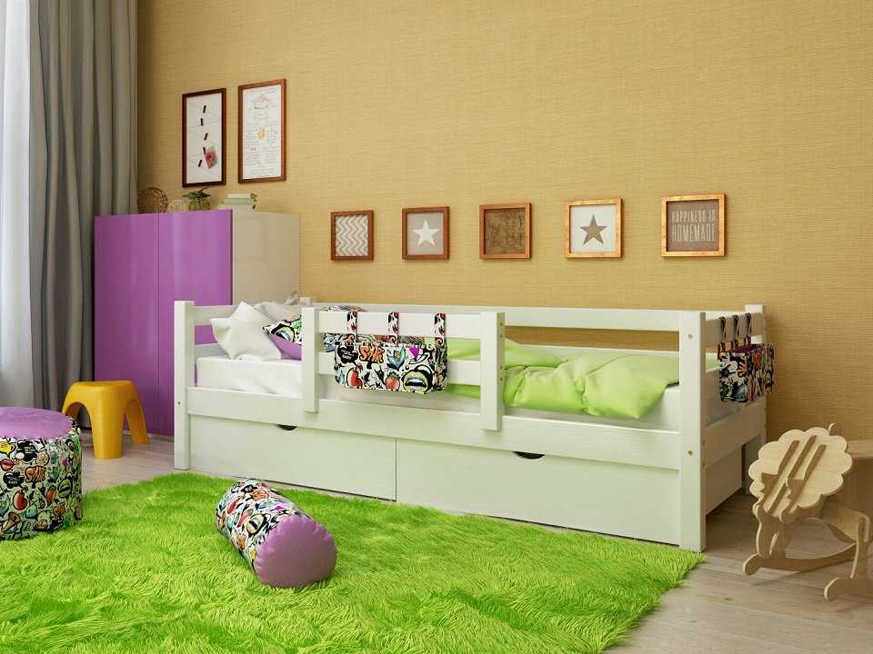 - От 3 до 15. Очень удобные и практичные модели. Первоначально размер спального места составляет 80 или 90 см. По мере роста ребенка оно наращивается за счет комода и ящиков, которые входят в комплект. Ограничители всегда съемные, они либо входят в комплект поставки, либо приобретаются отдельно. Если кроватка будет стоять возле стены, достаточно будет использовать всего один бортик.