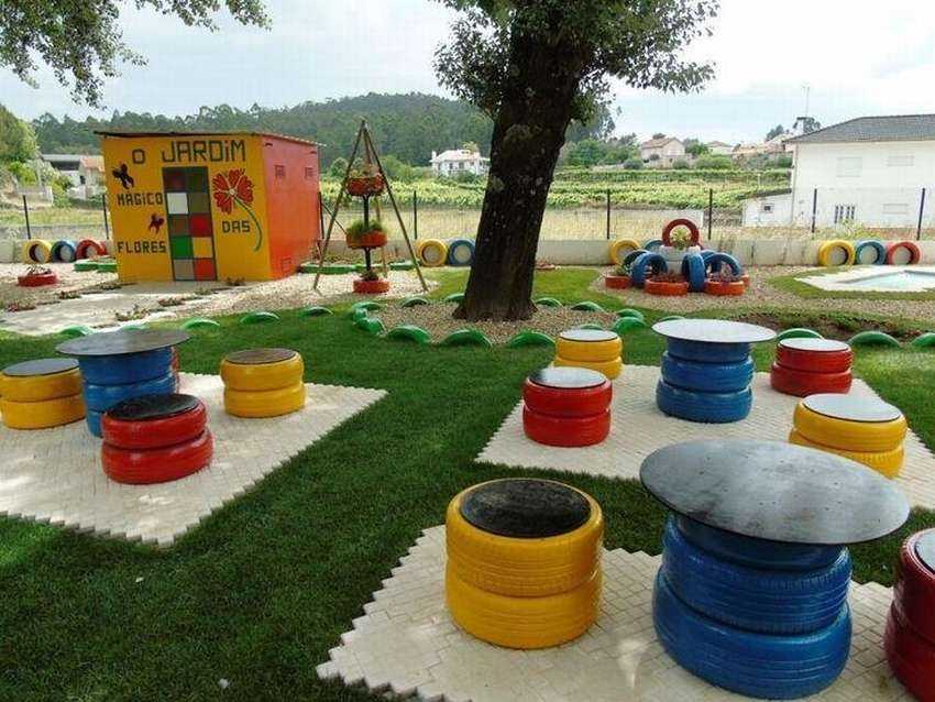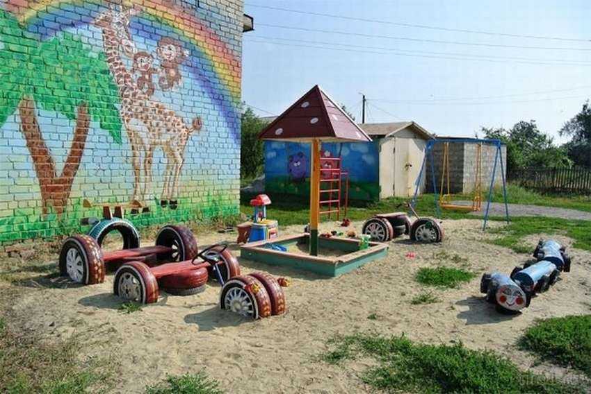 А также важно оформлять площадку дополнительными элементами и фигурками, сделанными из покрышек, поддонов и других подручных средств