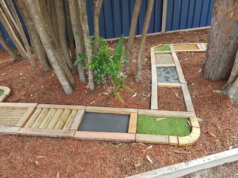 Массажный коврик на даче из природных материалов — песочек, трава, листья, щебёнка, брусочки