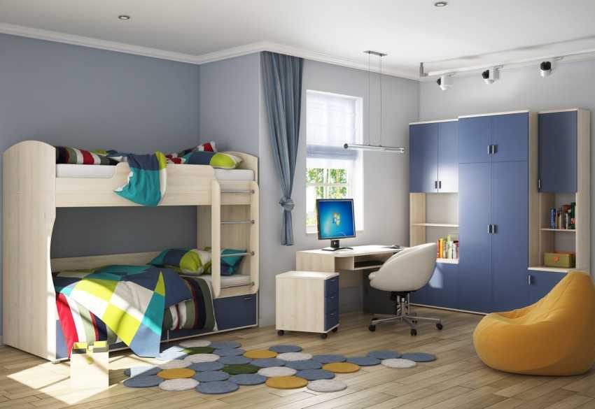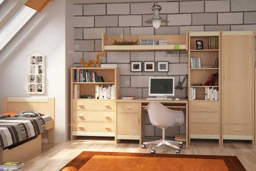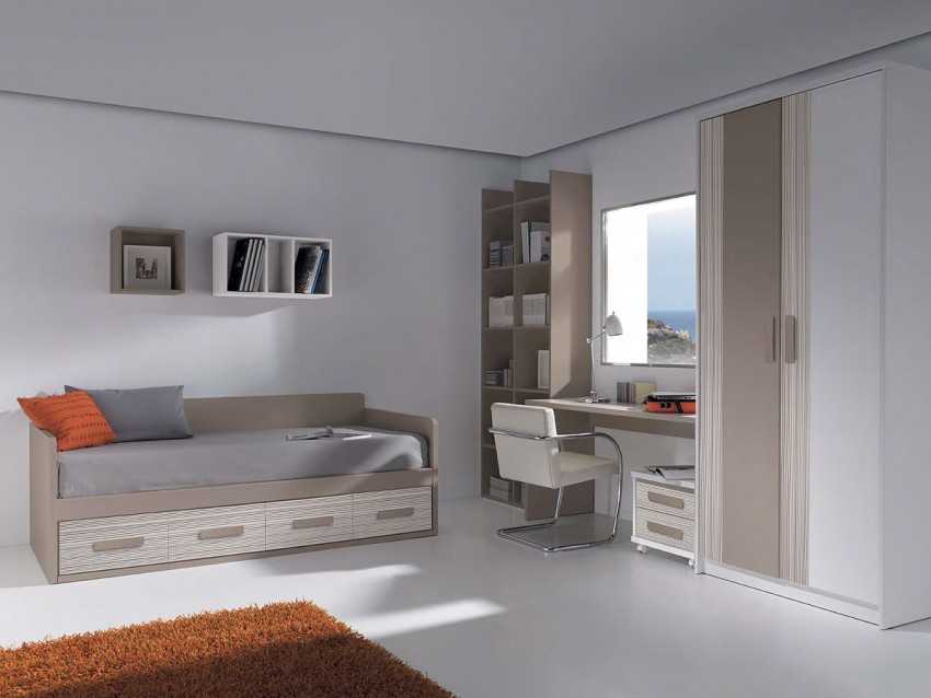 Шкаф и спальное место располагаются вдоль стены, подальше от окна. Рабочее место – у окна. Так доступ дневного света будет максимальным. Свободного места достаточно для игр.