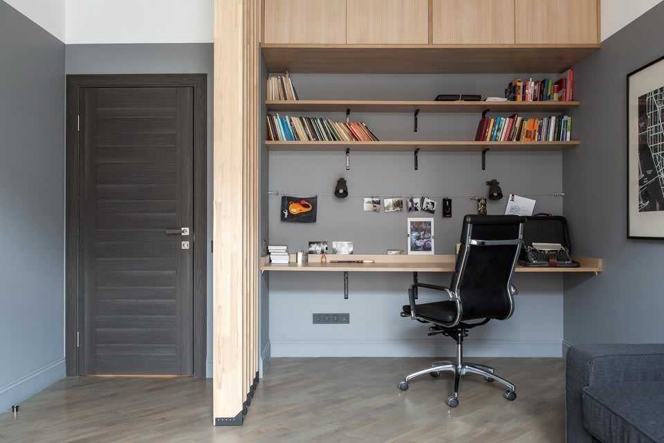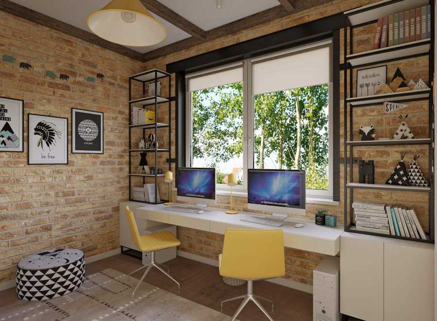 Ученический стол в просторных комнатах можно располагать вдоль глухой стены. Главное преимущество такого решения – возможность установки полок над столешницей. Недостаток – выраженная нехватка естественного освещения.
