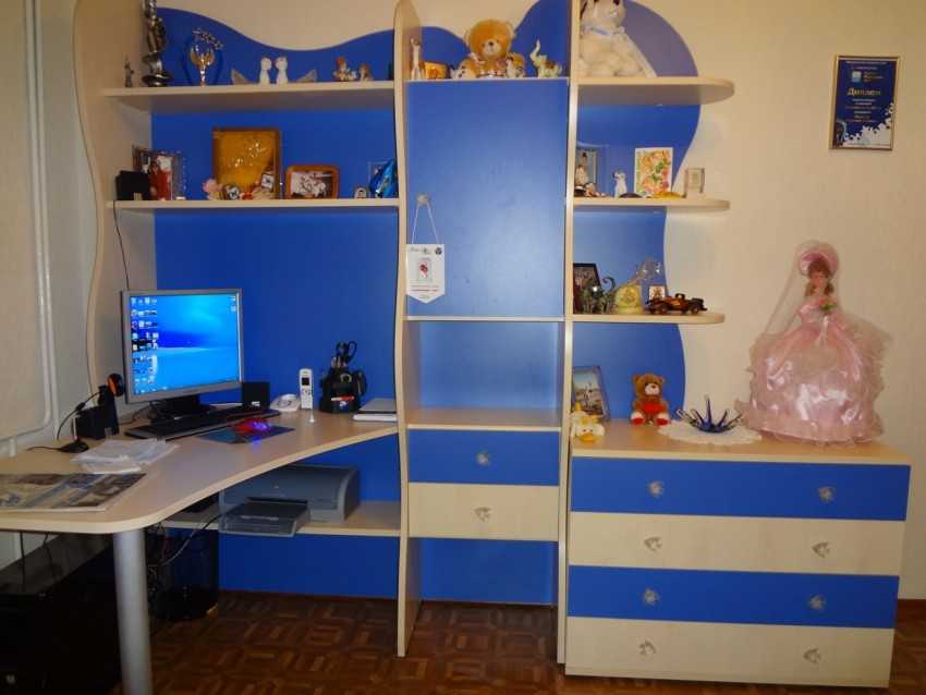 Угловой. Такое расположение стола весьма удобно для малогабаритных помещений. Стол можно считать как письменным, так и компьютерным, так как большинство моделей угловых столов для детских комнат рассчитаны на работу с компьютером.