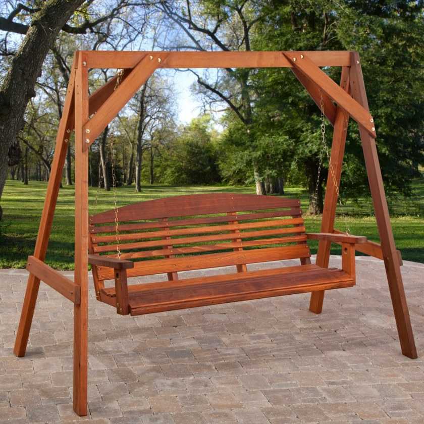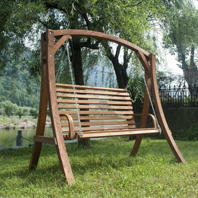 При желании можно проявить креативность мышления и устроить, например, вот такой каркас из клееного гнутого бруса. Эти дачные качели по сути – подвесное кресло, для которого вполне достаточно одного подвеса.