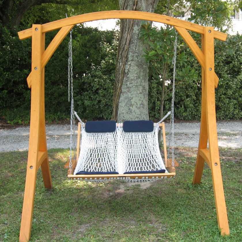 Такие качели можно подвесить к дереву или смастерить А-образную конструкцию, которая способна выдержать более высокие загрузки. Стойка может быть выполнена из древесины или метала.