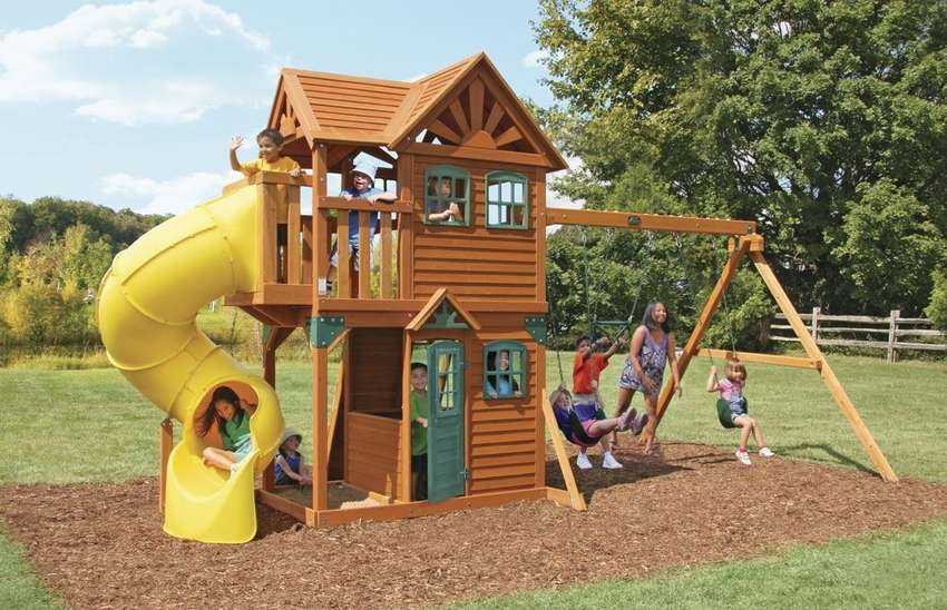 Домик для детской площадки это не просто деревянные куб с крышей. Это может быть целый комплекс разных сооружений с качелями и другими снарядами.