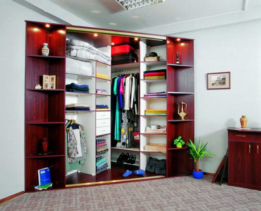 - пятистенной — данный вариант углового шкафа является одновременно наиболее громоздким и наиболее функциональным в плане внутреннего пространства. Имеет характерную выступающую угловую часть. Подходит только для просторных комнат.