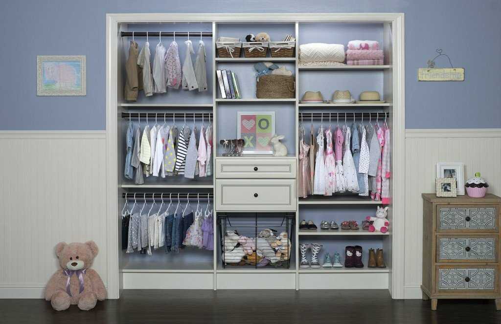 В детских гардеробных чаще всего используются штанги, ящики и полки. Совмещение нескольких элементов хранения позволяет хранить больше вещей. К примеру, в шкафах нередко обустраивают боковые приставные полки, на которые можно поставить цветы или книги.
