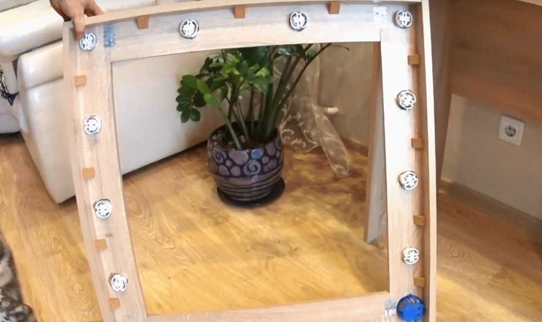 При удаленном расположении от окон светодиодного освещения недостаточно. Лампы дневного света или другие светильники фиксируются к столику с помощью саморезов или жидких гвоздей, чаще всего сверху или по боковому периметру зеркала. Отверстия под провода для их питания подготавливаются в корпусе заранее.
