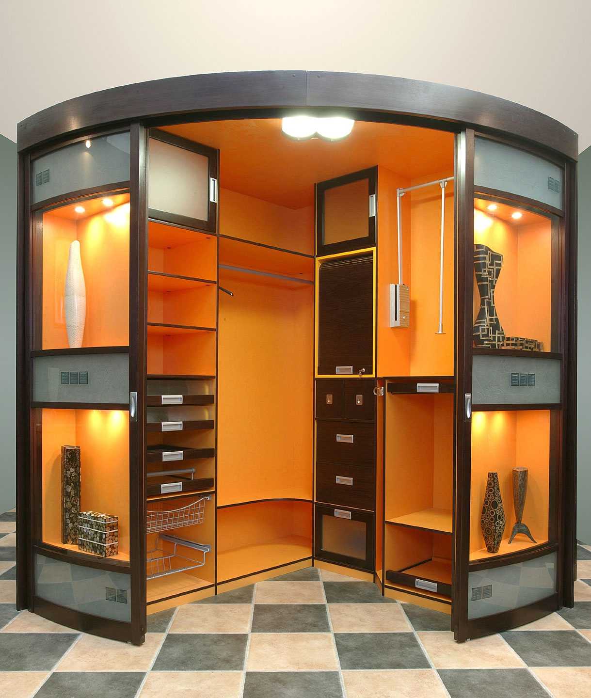 При оформлении гостиной или прихожей углы часто остаются незадействованными. Благодаря угловой мебели, полезное пространство используется по максимуму. Преимущество такой формы в значительно большей вместимости. Три варианта, как выглядят внутри угловые шкафы-купе: