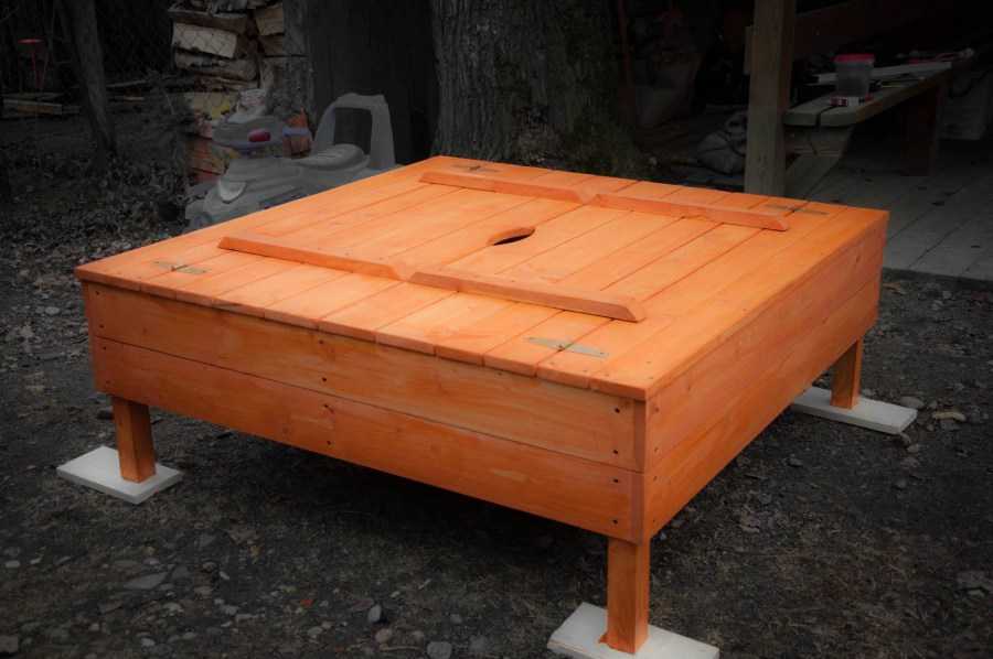 Из простых вариантов привлекательно выглядит песочница с откидной крышкой. Если покрасить ее в разные яркие оттенки или нанести рисунок, то она послужит украшением участка.