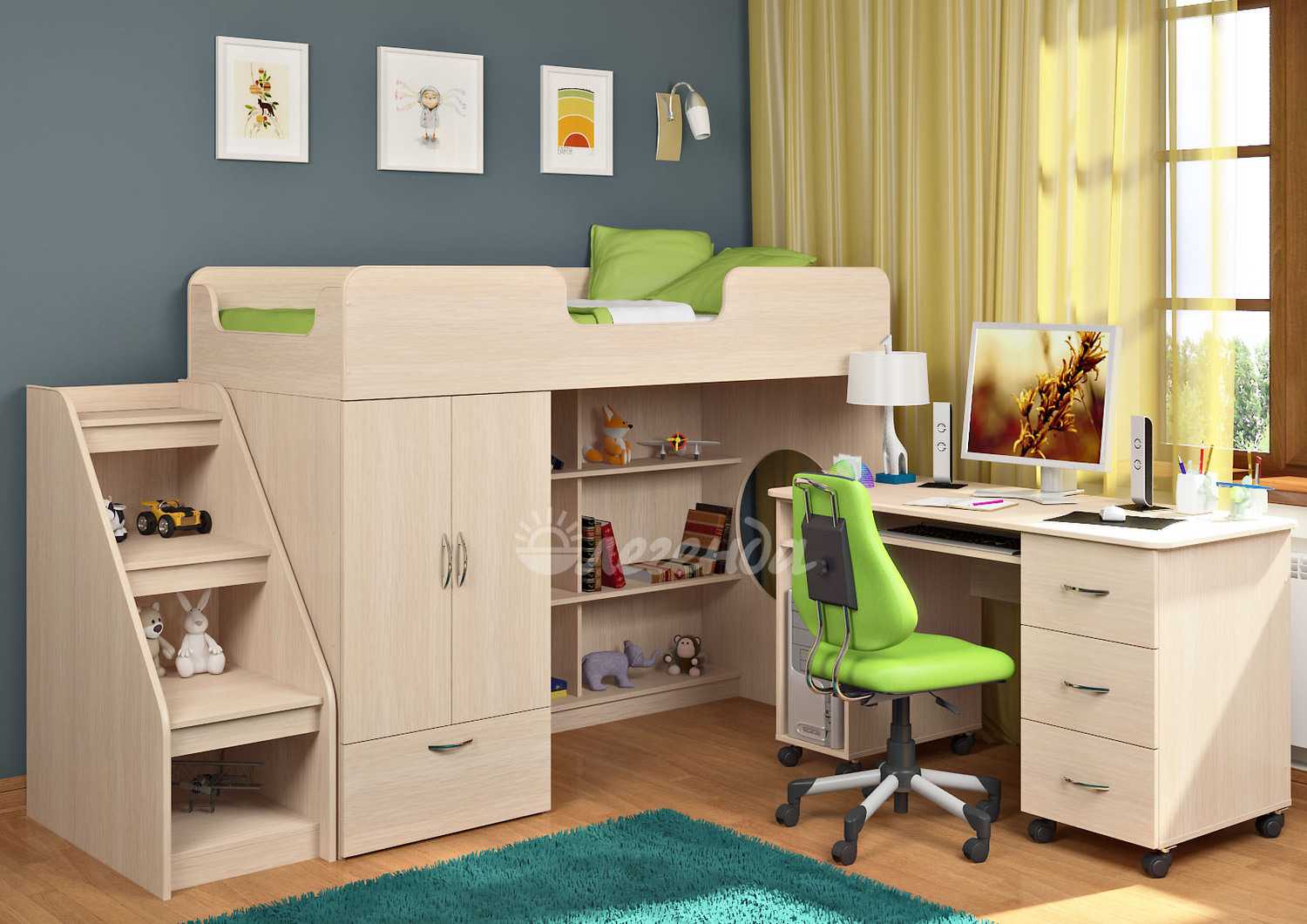 Кровать-чердак — настоящий конструктор, который может состоять из множества взаимозаменяемых элементов. Единственная обязательная часть — высокий каркас с кроватью сверху. Остальное зависит от вкуса и потребностей ребенка.