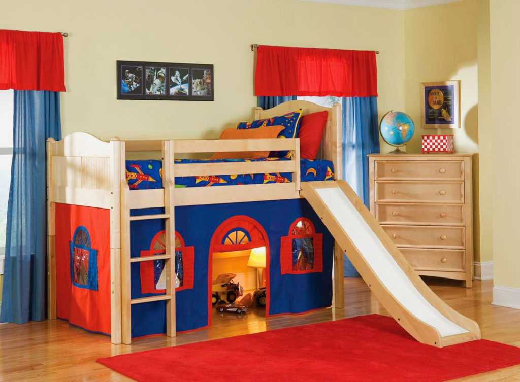 - Забавный элемент кровати-чердака для самых маленьких — деревянная горка для спуска с кровати. Если в комнате достаточно места, можно установить такую горку и ребенок точно надолго увлечется своим спальным комплексом.