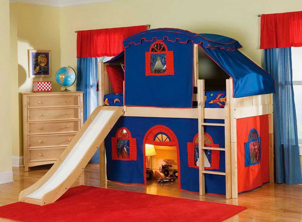 Кровать с зоной для игр для мальчишек часто имитирует внешний вид салона автомобиля, космического корабля, палатки в лесу или рыцарского замка. Этот потрясающий аттракцион подходит для увлекательных игр с друзьями.