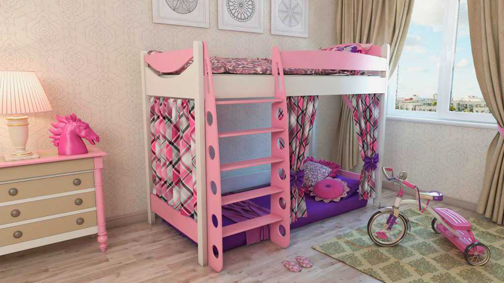 Отличным решением для девочек будет стилизация мебели под кукольный домик или замок принцессы. От спортивного инвентаря здесь можно отказаться в пользу инструментов для творчества. Например, на нижнем уровне кровати размещается мольберт или доска для рисования.
