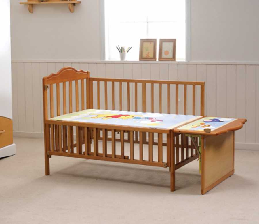 - Функциональность кроватки. Приобретая детскую кровать необходимо продумать все до мельчайших деталей, тогда покупка будет удачной, а пользоваться кроватью мама и малыш будут с большим удовольствием. Так, имеются модели со съемной боковой стенкой. Если такую детскую кровать присоединить к родительскому спальному месту, то мама и малыш получат дополнительные удобства – маме не придется вставать на ночные кормления, а делать это прямо в собственной постели. Есть модификации со съемными боковыми рейками, что дает возможность малышу постарше быть более самостоятельным – самому залезать и выбираться из своей кровати. Для практичных родителей идеальным решением станет универсальная кровать трансформер для новорожденных – здесь есть место для пеленания и переодевания малыша, имеются отделы для хранения детских принадлежностей и игрушек, к тому же такая модель прослужит вам 3-4 года и более. Дети, привыкшие к укачиванию, будут отлично засыпать в кроватках с маятником, либо моделях, дополнительно оснащенных полозьями или колесиками. Не забывайте, чтобы вся мебельная фурнитура была предельно качественной и безопасной.