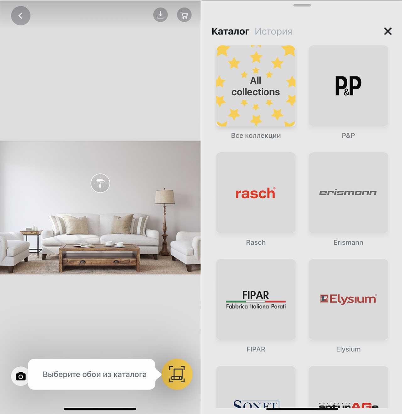 А если фотографировать свою стену лень, или неудобно – прямо в приложении есть большой фотобанк гостиных, спален и прочих помещений. Выбирай тот готовый снимок, который больше всего похож на твою квартиру и примеряй обои к этой виртуальной комнате.