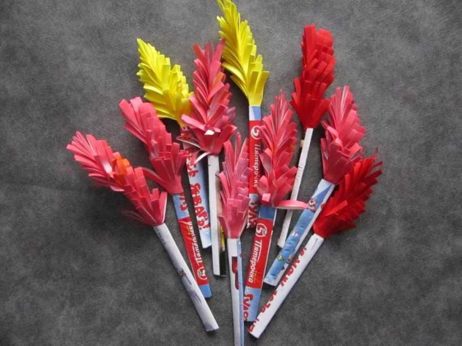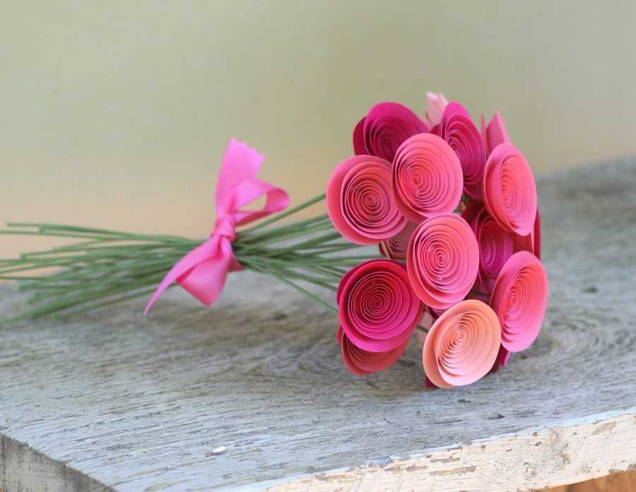 Те же действия проводят со второй половиной бумаги. Число деталей должно равняться количеству стеблей. Далее собирают букет, фиксируя его составные части клеем.