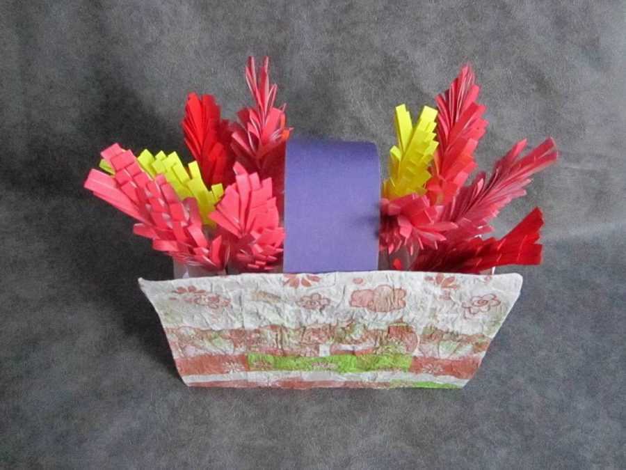 Этот вариант поделки для детей из бумаги и картона лучше предложить ребёнку перед 8 марта. Ничего сложного здесь нет. Помощь родителей понадобится лишь совсем юным мастерам. Необходимые материалы: