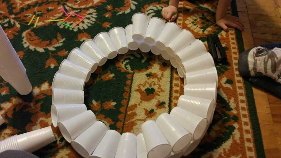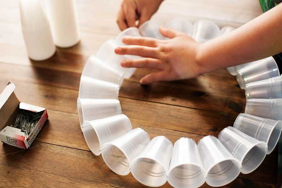 - Из пенопластовых контейнеров выстригаются чашечки-цветочки из расчета 5-7 штук на 50-сантиметровый стебель.