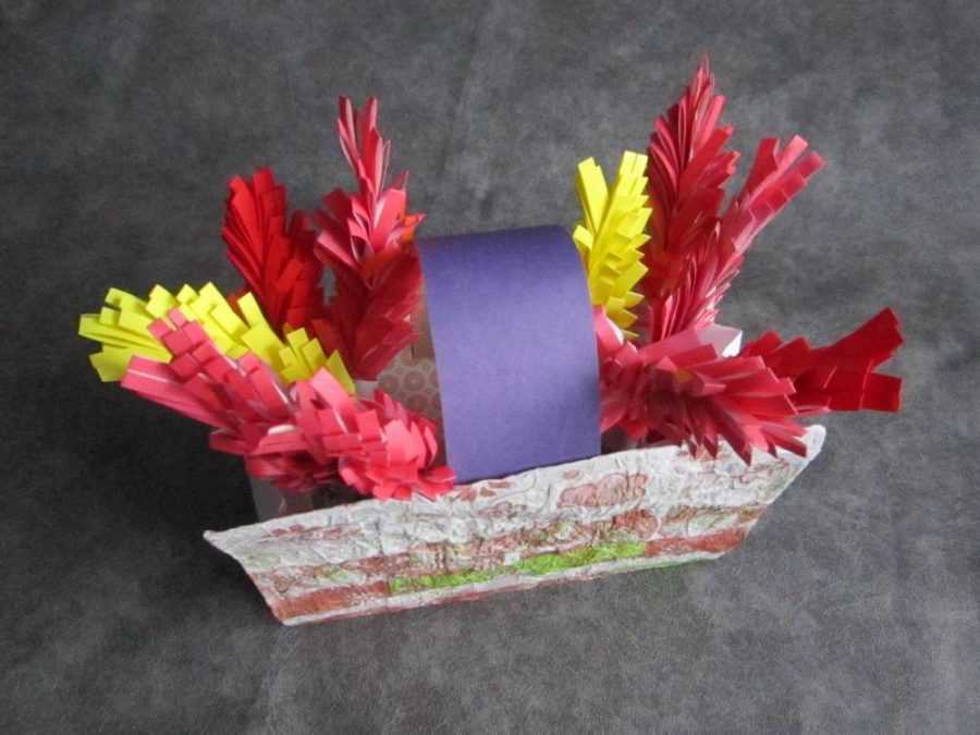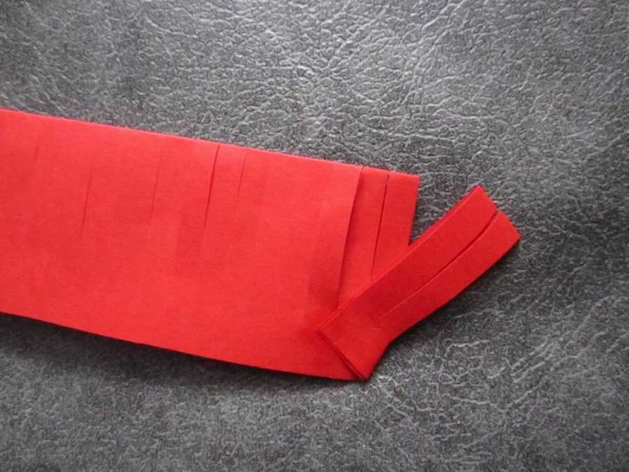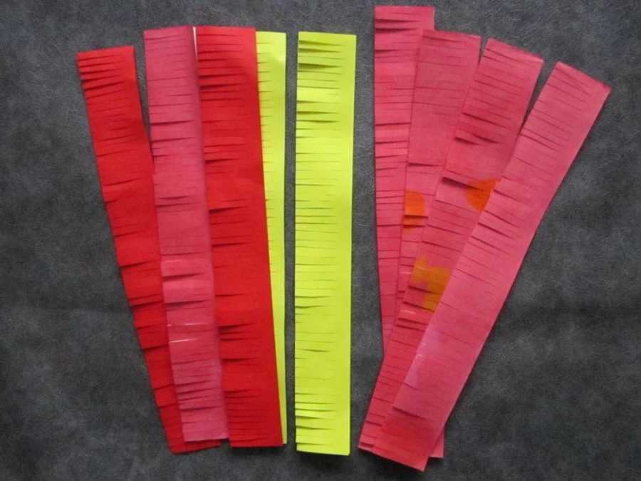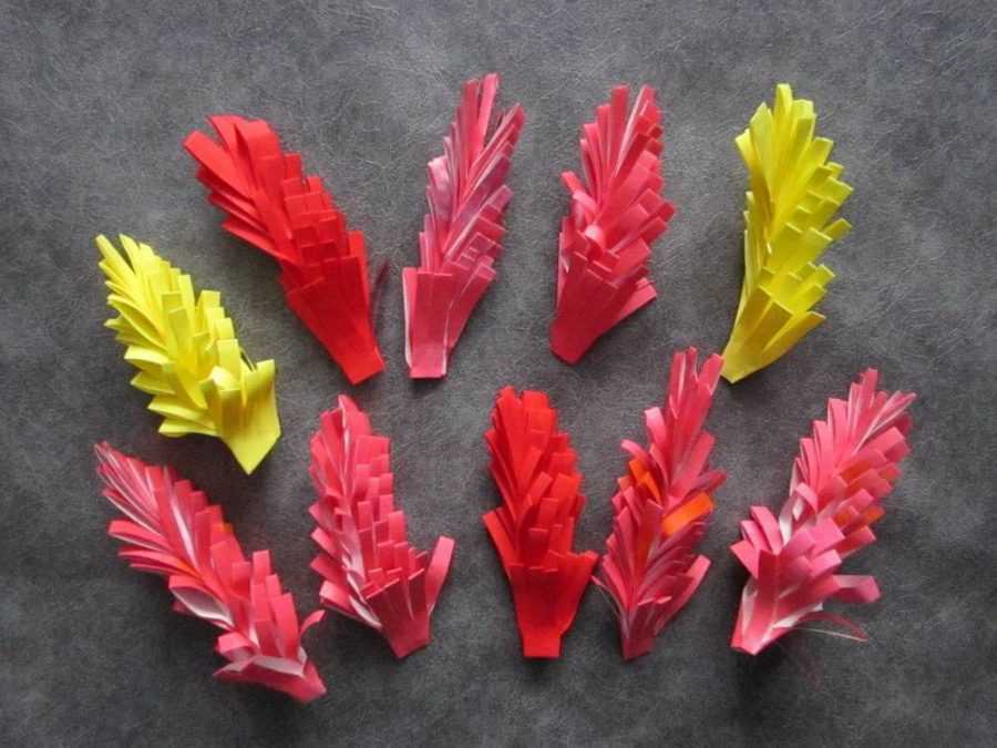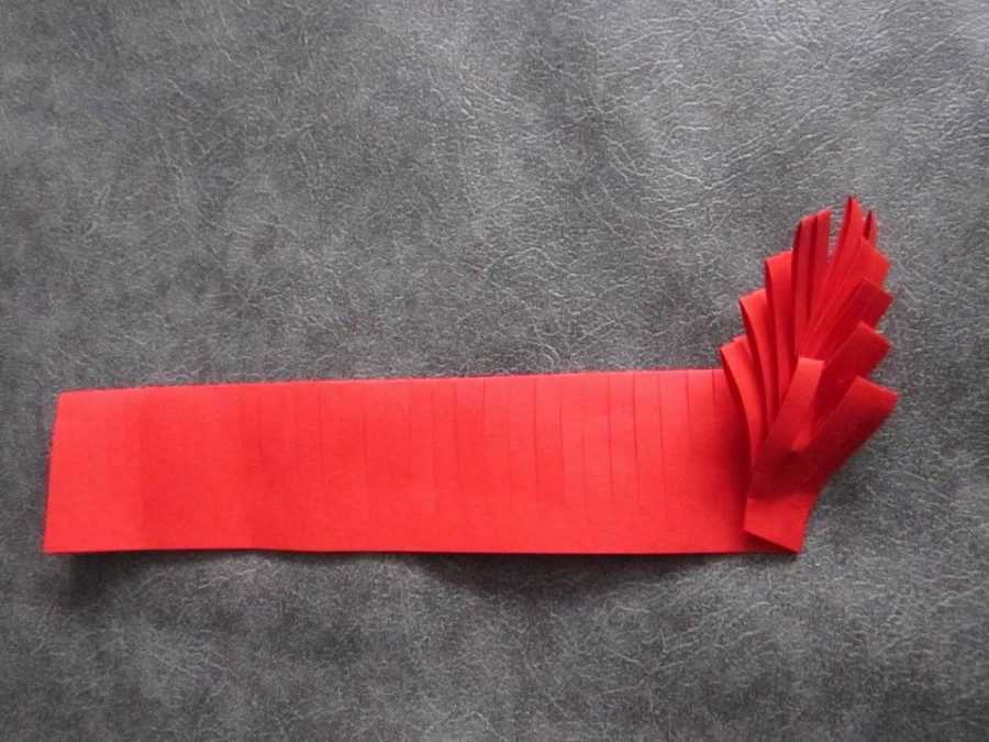 Решетка нарезается на чешуйки-лепестки, которые окрашиваются красным цветом. Затем лепестки внахлест приклеиваются друг к другу так, чтобы получился пышный цветок.