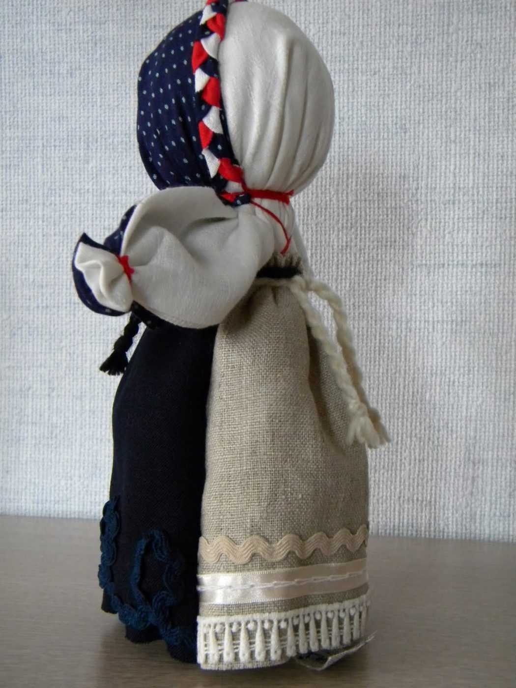 С помощью наполнителя уплотняется туловище, фиксируется так же, как и голова. Далее кукла оформляется тканями других цветов, которые подвязываются, образуя юбки, фартуки и платки.