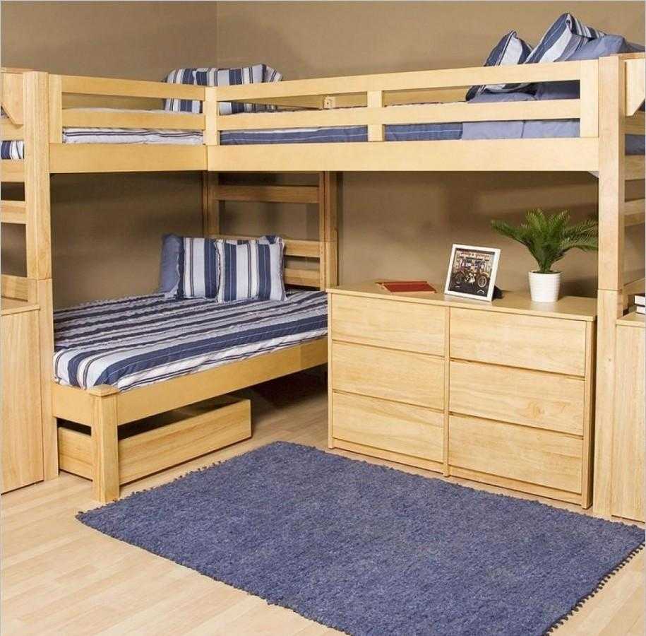 Иногда нижние кровати в угловой конструкции производители снабжают колесиками, чтобы их можно было передвинуть в другое место комнаты. Ярусы не соединены в жесткую конструкцию.